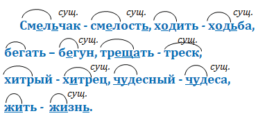 Смельчак (сущ.) — смелость (сущ.), ходить (глаг.) — ходьба (сущ.), бегать (глаг.) — бегун (сущ.), трещать (глаг.) — треск (сущ.), хитрый (прил.) — хитрец (сущ.), чудесный (прил.) — чудеса (сущ.), жить (глаг.) — жизнь (сущ.).