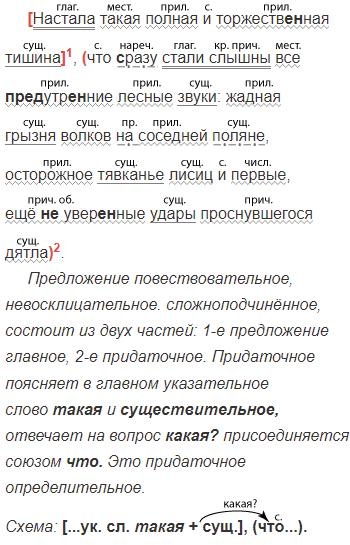 Через несколько минут ветер стих и деревья (с)нова2 застыли в холодном оц..ппенени.. . Настала такая полная и торжеств..ная тишина что (с)разу стали слышны все (пред)утр..ние лесные звуки жадная грызня волков на соседней поляне осторожное тявканье лисиц и первые ещё (не)увер..ные удары проснувшегося дятла.4 (По Б. Полевому)